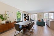 The lower floor features an impressive open-plan living and entertaining space, flooded with natural light from floor-to-ceiling windows. The contemporary kitchen is beautifully appointed with modern integrated appliances and a central island. Doors lead directly onto a private terrace, ideal for outdoor dining. Further benefits include a utility area and a convenient downstairs WC.